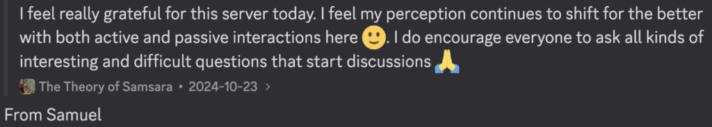 Join our growing online Sangha! As followers of The Theory of Samsara, we’ve created a supportive Discord community to connect, learn, and grow together on our spiritual journey. Our server members encompass all walks of the spiritual path and are seeking answers to questions about life and spirituality. Our members are also looking for a space where they can build a support system of online friends to aid their spiritual development.